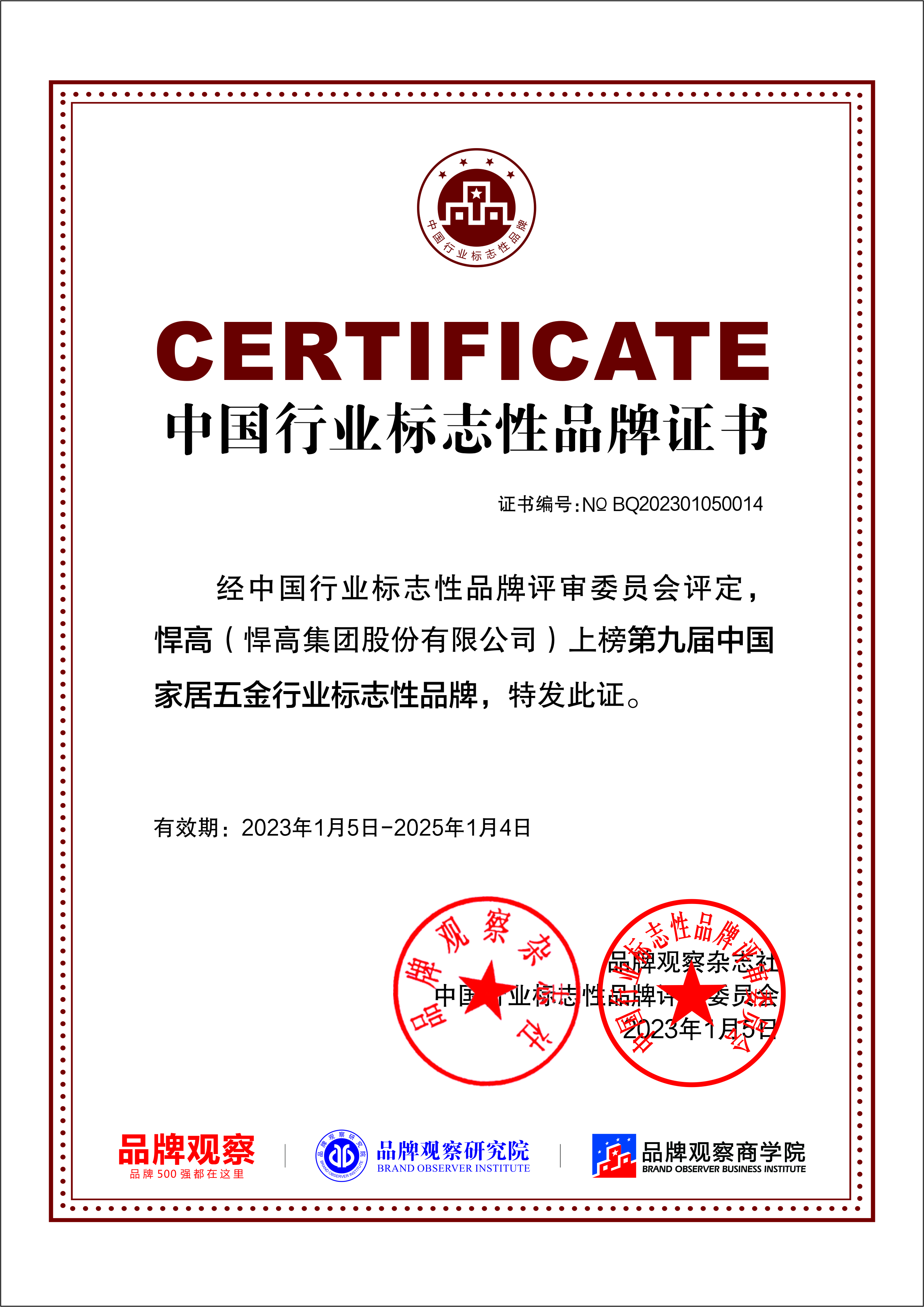 中国行业标志性品牌是指能够代表中国同行或在全球同行中较有影响力的品牌 鉴黄师官方版,每个行业只有一个品牌能获得这项荣誉,体现了企业的唯一性和排他性,由此可见,悍高在中国乃至全球家居五金行业拥有高影响力,号召力和认可度,是行业当之无愧的排头兵。